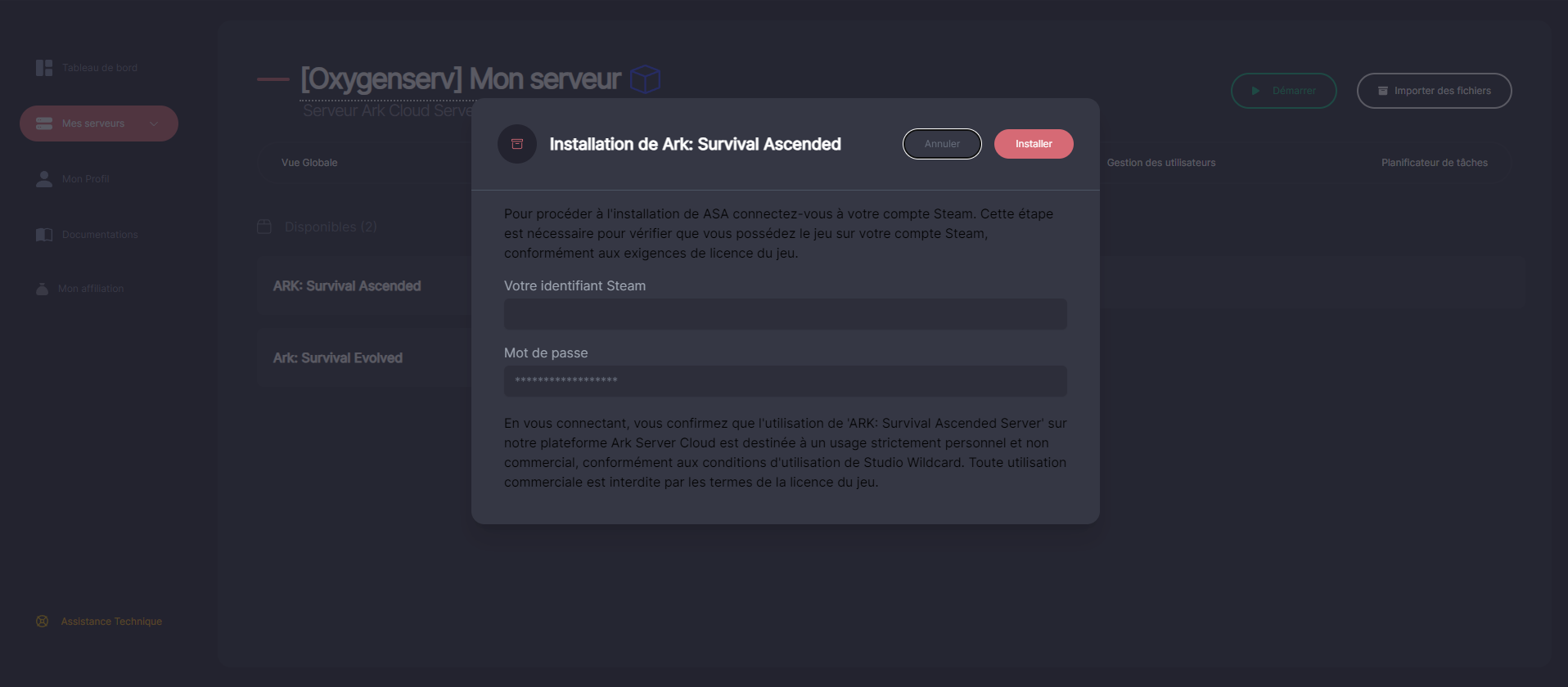 Ce guide montre comment **installer un serveur ARK: Survival Ascended (ASA)** sur Oxygenserv.\