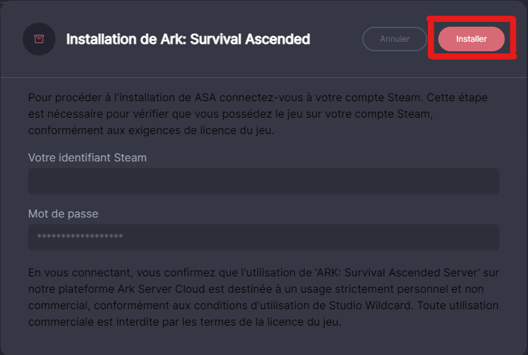 ARK impose une étape de validation pour autoriser l’installation du serveur.