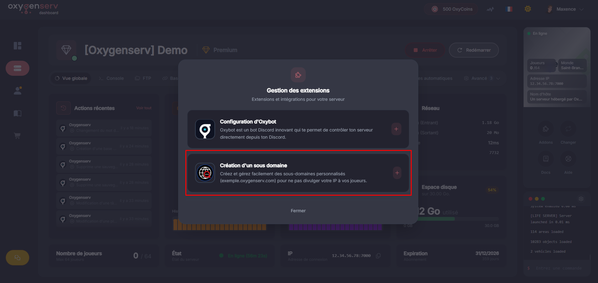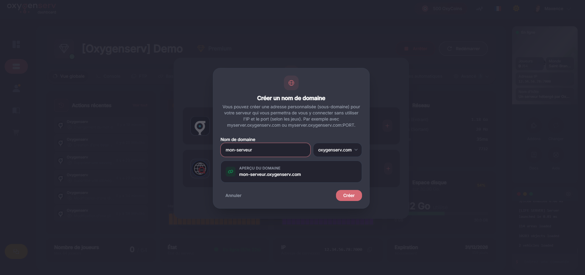 Cette option crée un **sous-domaine Oxygenserv**. Exemple : `monserveur.oxygenserv.com`.