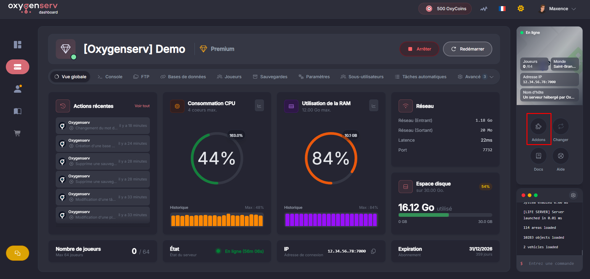 Si votre jeu utilise un port spécifique, ajoutez `:PORT`. Exemple : `monserveur.oxygenserv.com:30120`.